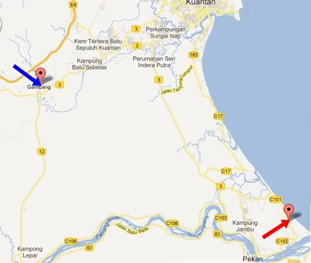 (Arrow biru lokasi kampus Gambang; 3.718885 , 103.12093700000003, arrow merah lokasi kampus pekan; 3.546709 , 103.43533200000002) |